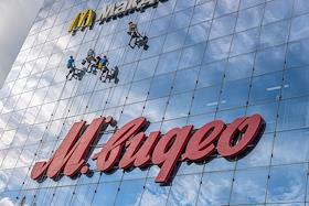 Жанровая фотография. Рабочие моют стеклянную стену торгового центра. Вывеска ресторана "Макдоналдс" (McDonald`s).