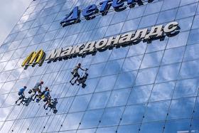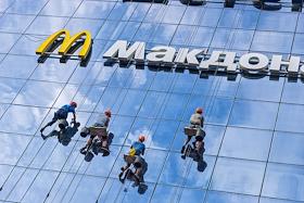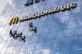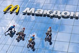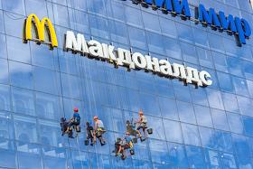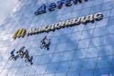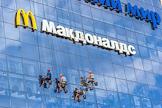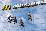 Жанровая фотография. Рабочие моют стеклянную стену торгового центра. Вывеска ресторана "Макдоналдс" (McDonald`s).