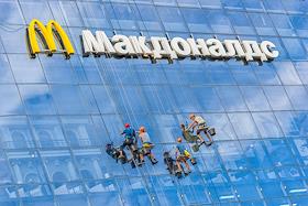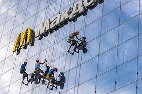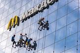 Жанровая фотография. Промышленные альпинисты моют стеклянную стену торгового центра. Вывеска ресторана "Макдоналдс" (McDonald`s).