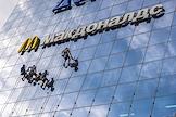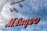 Жанровая фотография. Рабочие моют стеклянную стену торгового центра.Вывеска ресторана "Макдоналдс" (McDonald`s).