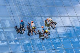Жанровая фотография. Рабочие моют стеклянную стену торгового центра.