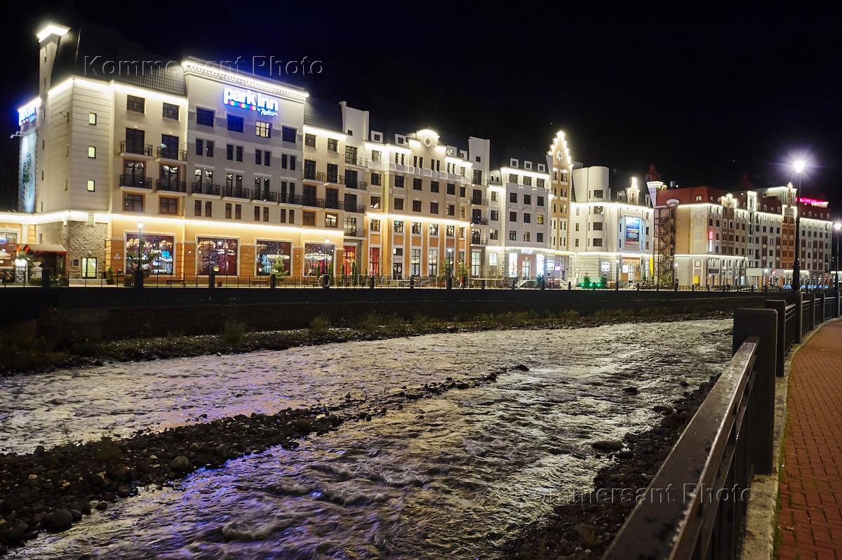 Passersby walk down the streets of Rosa Khutor Alpine Resort.