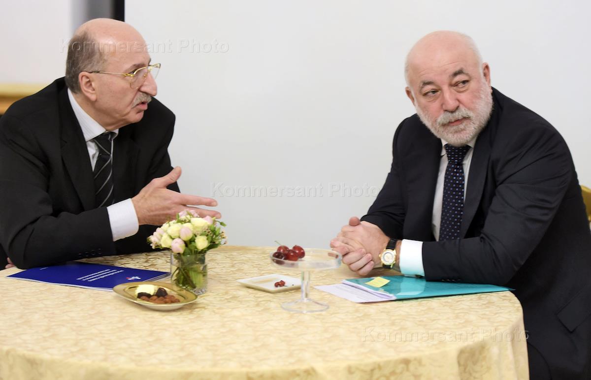 Встреча президента России Владимира Путина с представителями российских деловых кругов прошла в Кремле. Председатель совета директоров некоммерческого партнерства "Русбренд" Давид Якобашвили (слева) и совладелец группы "Ренова", президент фонда "Сколково" Виктор Вексельберг (справа) перед началом встречи.