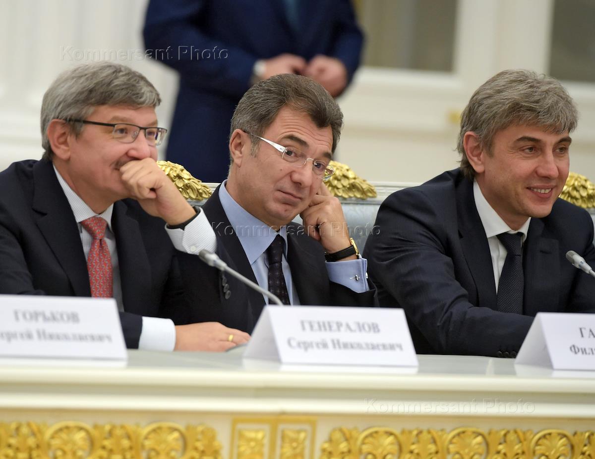 Встреча президента России Владимира Путина с представителями российских деловых кругов прошла в Кремле. Слева направо: глава группы "Промышленные инвесторы" Сергей Генералов, председатель совета директоров ЗАО "Евроцемент-групп" Филарет Гальчев и генеральный директор торговой сети супермаркетов "Магнит" Сергей Галицкий во время встречи.