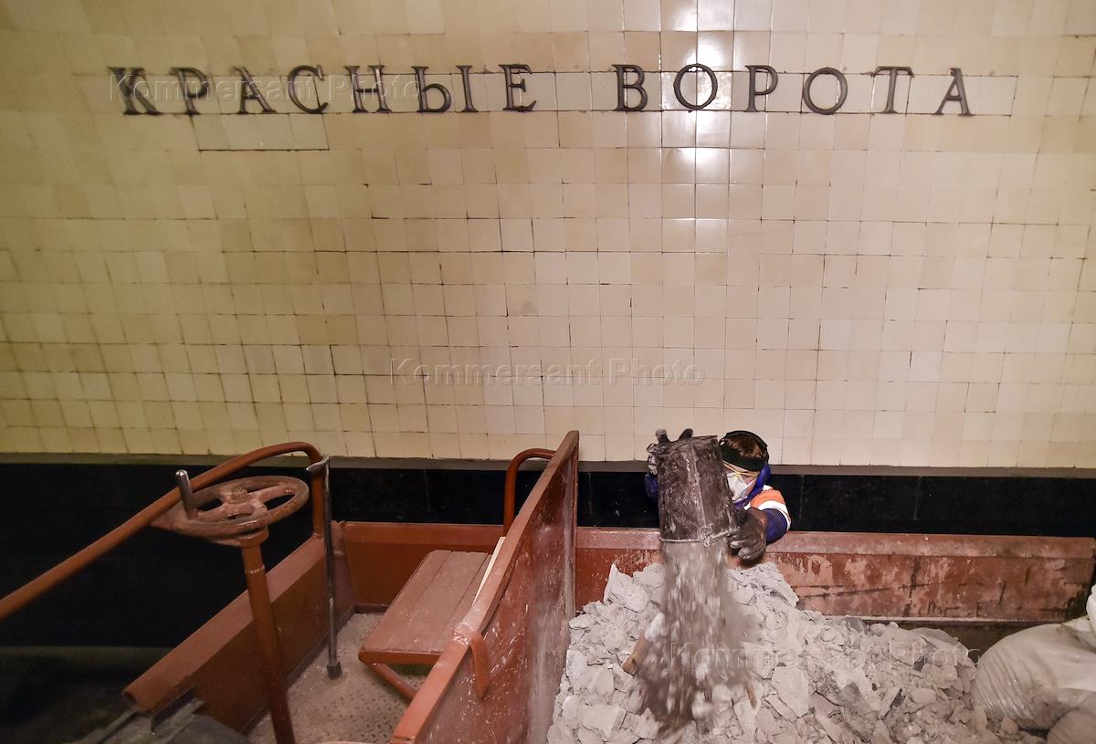 "Технологическое окно" на 1 линии центрального участка Сокольнической линии. Рабочий во время работ по уборке строительного мусора.