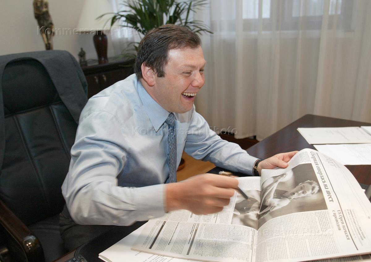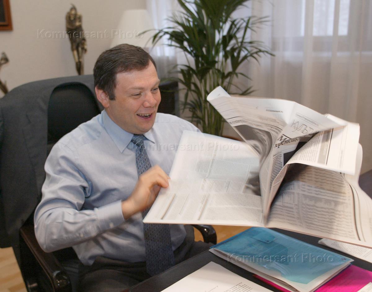 Председатель совета директоров консорциума "Альфа-групп" Михаил Фридман читает газету "КоммерсантЪ" в своем рабочем кабинете.