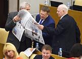 Пленарное заседание Государственной думы (ГД) России. Член комитета ГД России по физической культуре, спорту, туризму и делам молодежи Василий Власов (слева), лидер Либерально-демократической партии России (ЛДПР) Владимир Жириновский (в центре) и член комитета ГД России по информационной политике, информационным технологиям и связи Вадим Деньгин (справа) во время заседания.