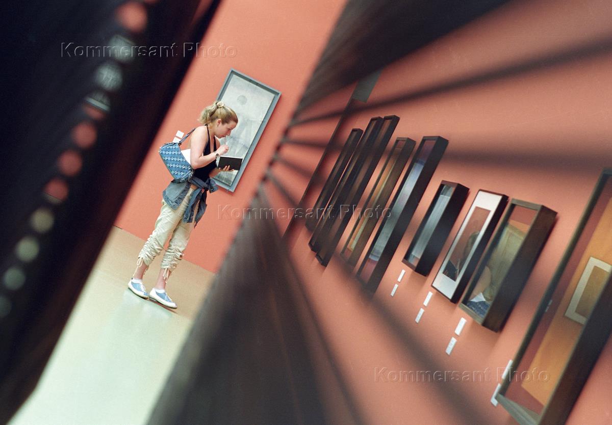 Посетительница на выставке испанского художника Эусебио Семпере, которая состоялась в выставочном зале Новый Манеж.