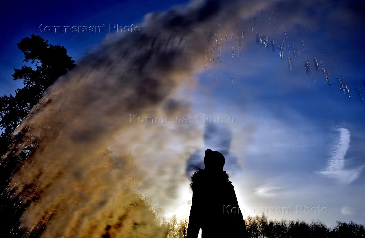 Жанровая фотография. Сильные морозы. Пар от разлитой в воздухе воды.