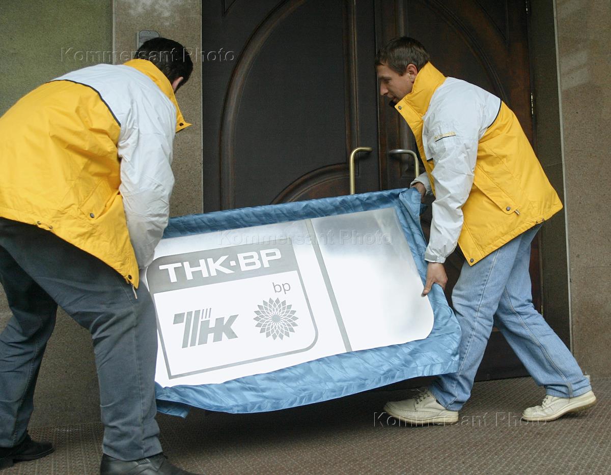 Workers change the sign at the TNK (Tuymen oil company) office at Schipok street. Now it will be called "BP-TNK".
