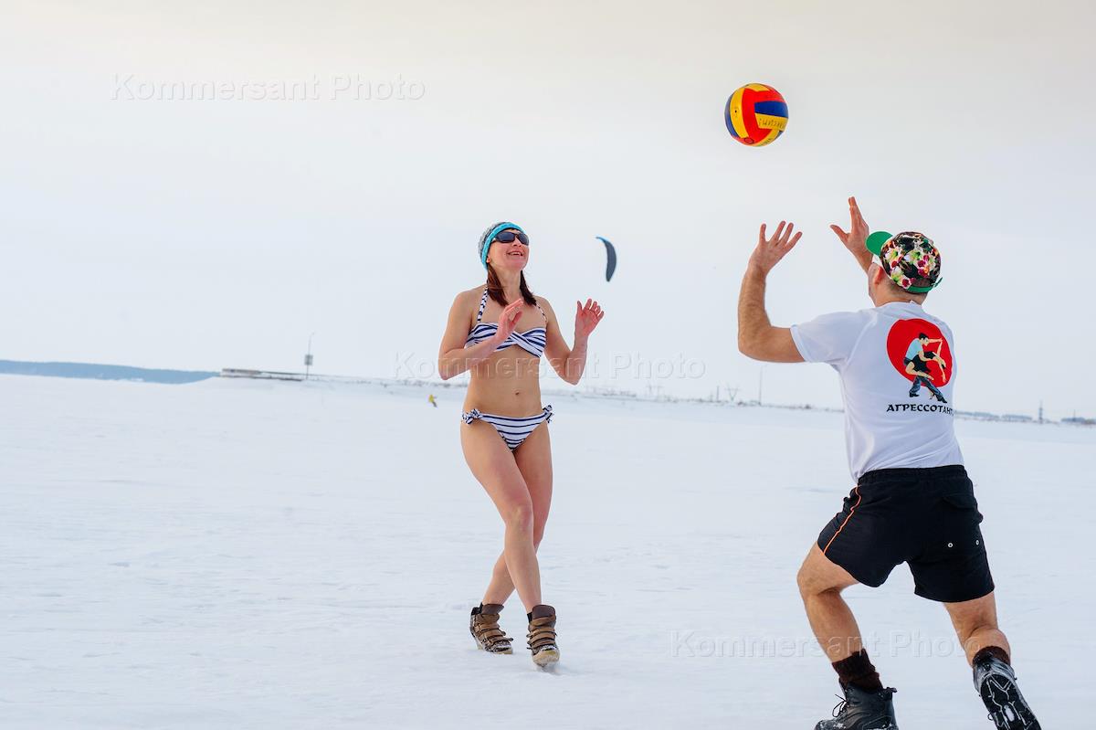 Жанровая фотография. Зимний отдых жителей Новосибирска. Люди играют в мяч и загорают на льду Обского водохранилища.