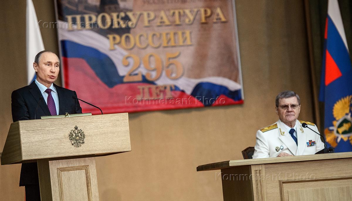 Президент России Владимир Путин (слева) и Генеральный прокурор России Юрий Чайка (справа) во время торжественного заседания, посвященного 295-летию Российской прокуратуры.