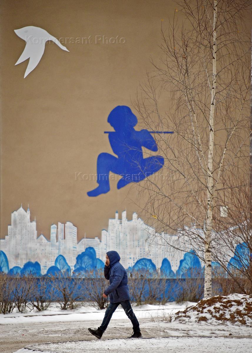Жанровая фотография. Виды города Котлас. Молодой человек идет и говорит по мобильному телефону на фоне мастерски разрисованной стены здания.