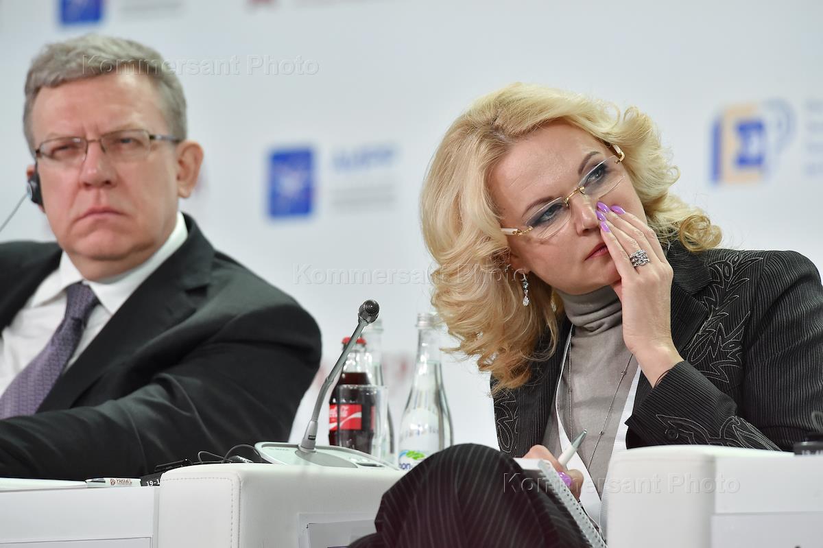 VIII Гайдаровский форум "Россия и мир: выбор приоритетов" прошел в Российской академии народного хозяйства и государственной службы при президенте России (РАНХиГС). Председатель совета фонда Центра стратегических разработок, заместитель председателя Экономического совета при президенте России Алексей Кудрин (слева) и председатель Счетной палаты Татьяна Голикова (справа) во время работы форума.
