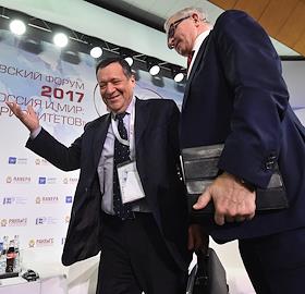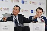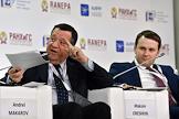 VIII Гайдаровский форум "Россия и мир: выбор приоритетов" прошел в Российской академии народного хозяйства и государственной службы при президенте России (РАНХиГС). Президент Российского союза промышленников и предпринимателей Александр Шохин (права) и председатель комитета Государственной Думы России по бюджету и налогам Андрей Макаров (слева) во время работы форума.