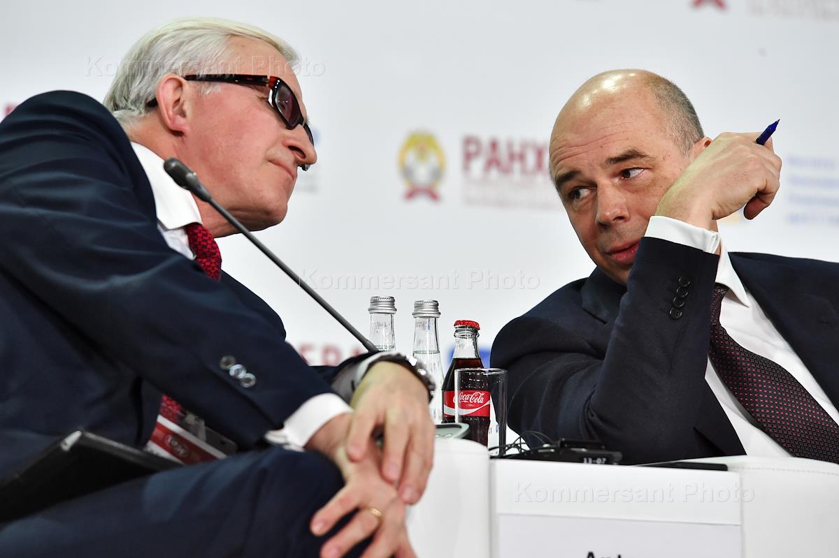 VIII Гайдаровский форум "Россия и мир: выбор приоритетов" прошел в Российской академии народного хозяйства и государственной службы при президенте России (РАНХиГС). Президент Российского союза промышленников и предпринимателей Александр Шохин (справа) и министр финансов России Антон Силуанов (слева) во время работы форума.