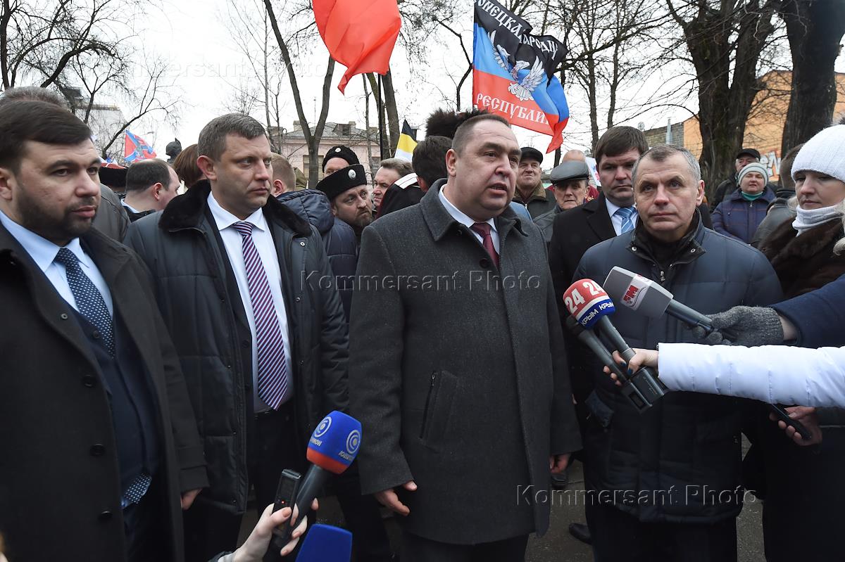 Митинг, посвященный 363-й годовщине Переяславской Рады, и церемония возложение цветов к памятнику Богдану Хмельницкому. Слева направо: заместитель председателя народного совета провозглашенной Донецкой народной республики (ДНР) Денис Пушилин, глава Донецкой Народной Республики Александр Захарченко, глава Луганской Народной Республики (ЛНР) Игорь Плотницкий и председатель Госсовета Республики Крым Владимир Константинов во время митинга.