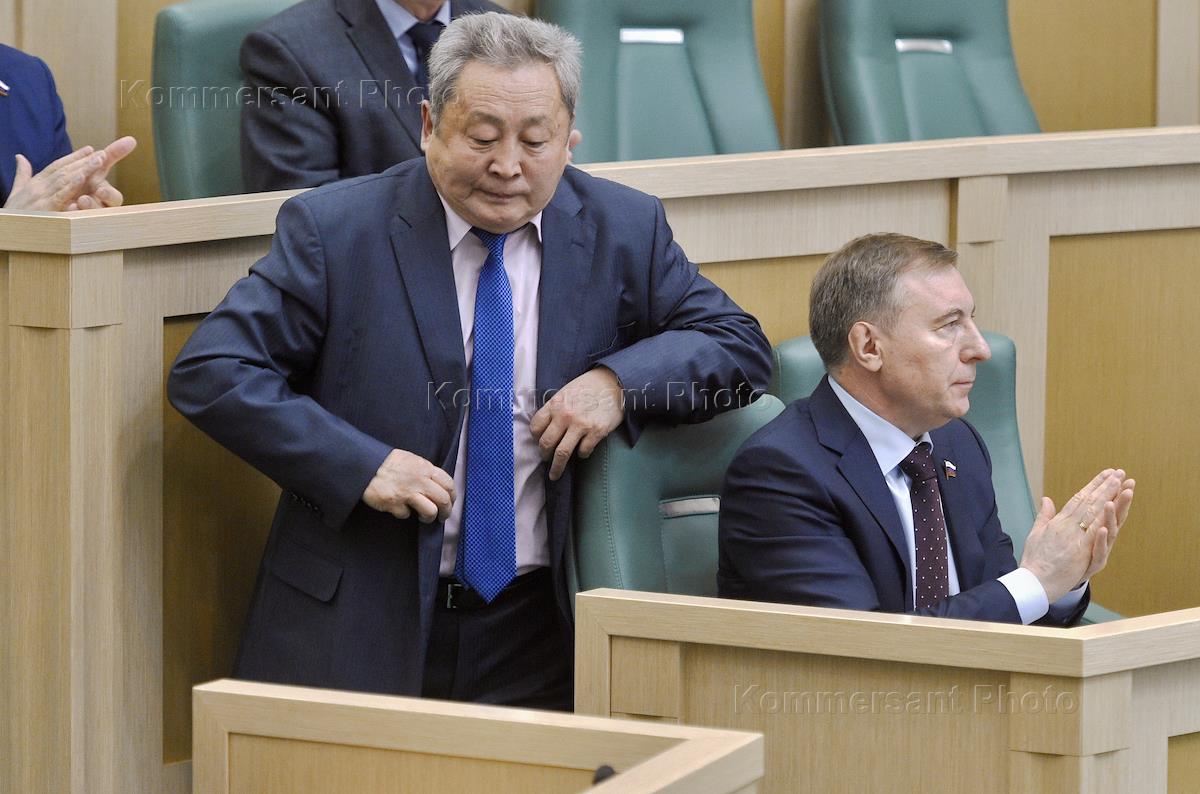 Пленарное заседание Совета Федерации (СФ) России. Представитель от исполнительного органа государственной власти Республики Бурятия Арнольд Тулохонов (слева) и представитель от законодательного (представительного) органа государственной власти Республики Бурятия Александр Варфоломеев (справа) во время заседания.