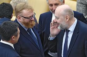 Пленарное заседание Государственной Думы (ГД) России. Председатель комитета ГД по государственному строительству и законодательству Павел Крашенинников (справа) и член комитета ГД России по международным делам Виталий Милонов перед началом заседания.