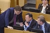 Пленарное заседание Государственной Думы (ГД) России. Член комитета ГД по труду, социальной политике и делам ветеранов Андрей Исаев (слева) и председатель комитета ГД по бюджету и налогам Андрей Макаров (второй слева) во время заседания.