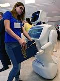 Всероссийский форум "Территория бизнеса – территория жизни" прошел в Общественной палате России. Жанровая фотография. Девушка стоит рядом с роботом (андроидом).