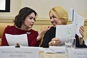Всероссийский форум "Территория бизнеса – территория жизни" прошел в Общественной палате России. Ведущая телеканала "Россия 24" Наталья Литовко (слева) и начальник управления продаж департамента обслуживания клиентов малого бизнеса ВТБ 24 (ЗАО) Елена Колесникова (справа) во время работы форума.