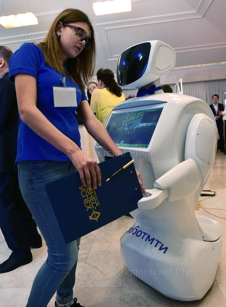 Всероссийский форум "Территория бизнеса – территория жизни" прошел в Общественной палате России. Жанровая фотография. Девушка стоит рядом с роботом (андроидом).