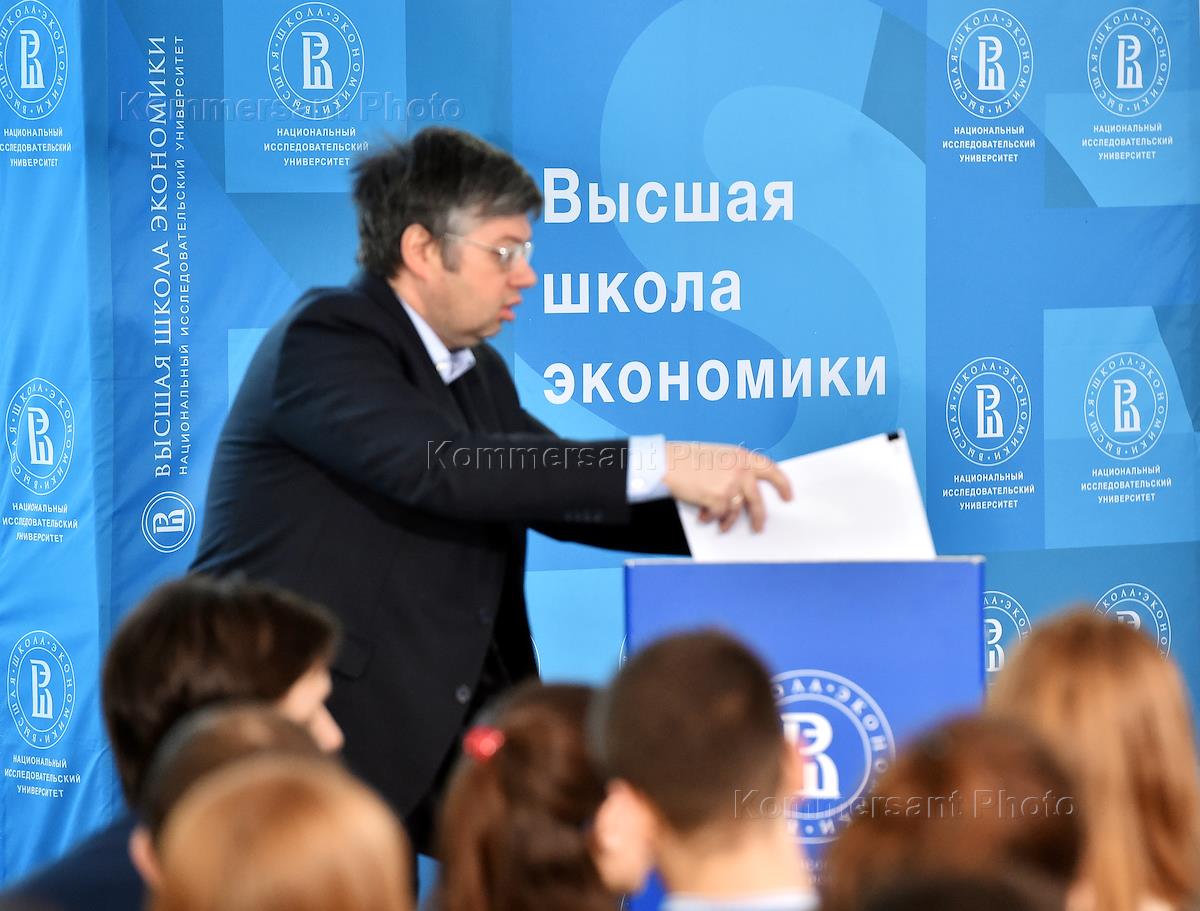 Ректор Национального исследовательского университета "Высшая школа экономики" Ярослав Кузьминов (второй слева), мэр Москвы Сергей Собянин (в центре) и президент Российского союза промышленников и предпринимателей (РСПП) Александр Шохин (справа) во время посещения Национального исследовательского университета "Высшая школа экономики".