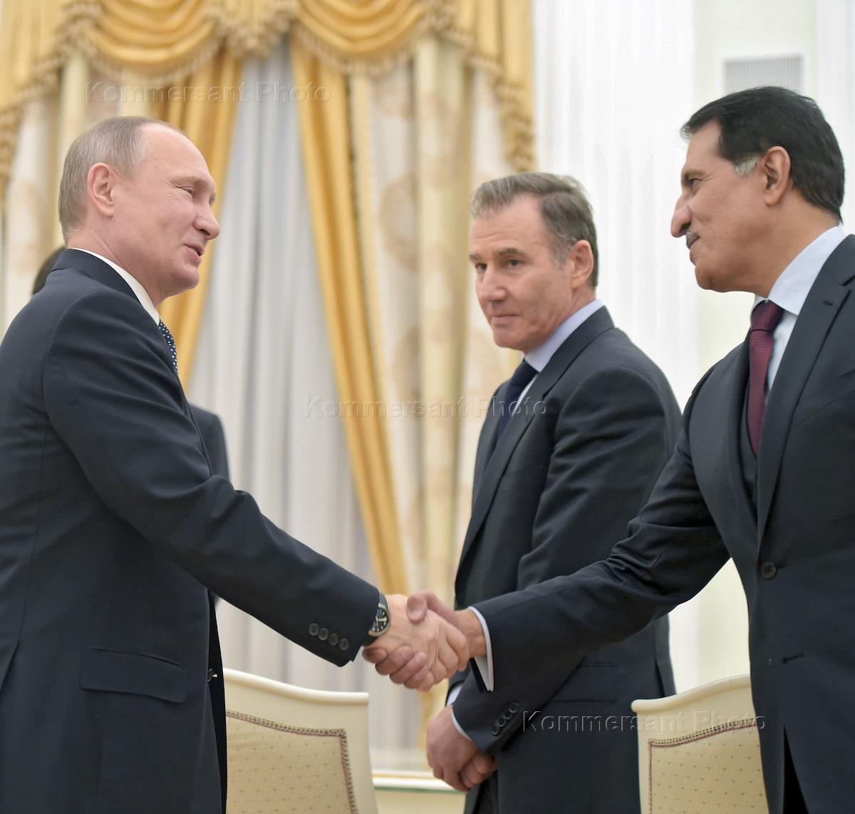Встреча президента России Владимира Путина с главой "Роснефти" Игорем Сечиным, руководством итальянского банка "Интеза" (Intesa Sanpaolo), Катарского инвестиционного фонда (Qatar Investment Autority) и компании "Гленкор" (Glencore). Слева направо: президент России Владимир Путин, главный исполнительный директор компании Glencore International Айвен Глазенберг и глава Суверенного фонда Катара Абдалла Бен Мохаммед Бен Сауд Аль Тани во время встречи.