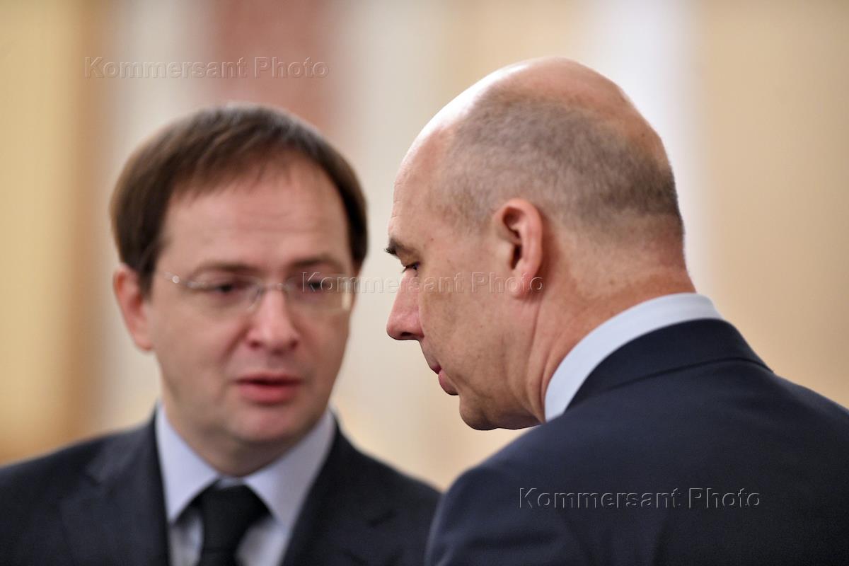 Заседание Правительства России. Министр финансов России Антон Силуанов (справа) и министр культуры России Владимир Мединский (слева) перед началом заседания.