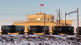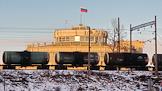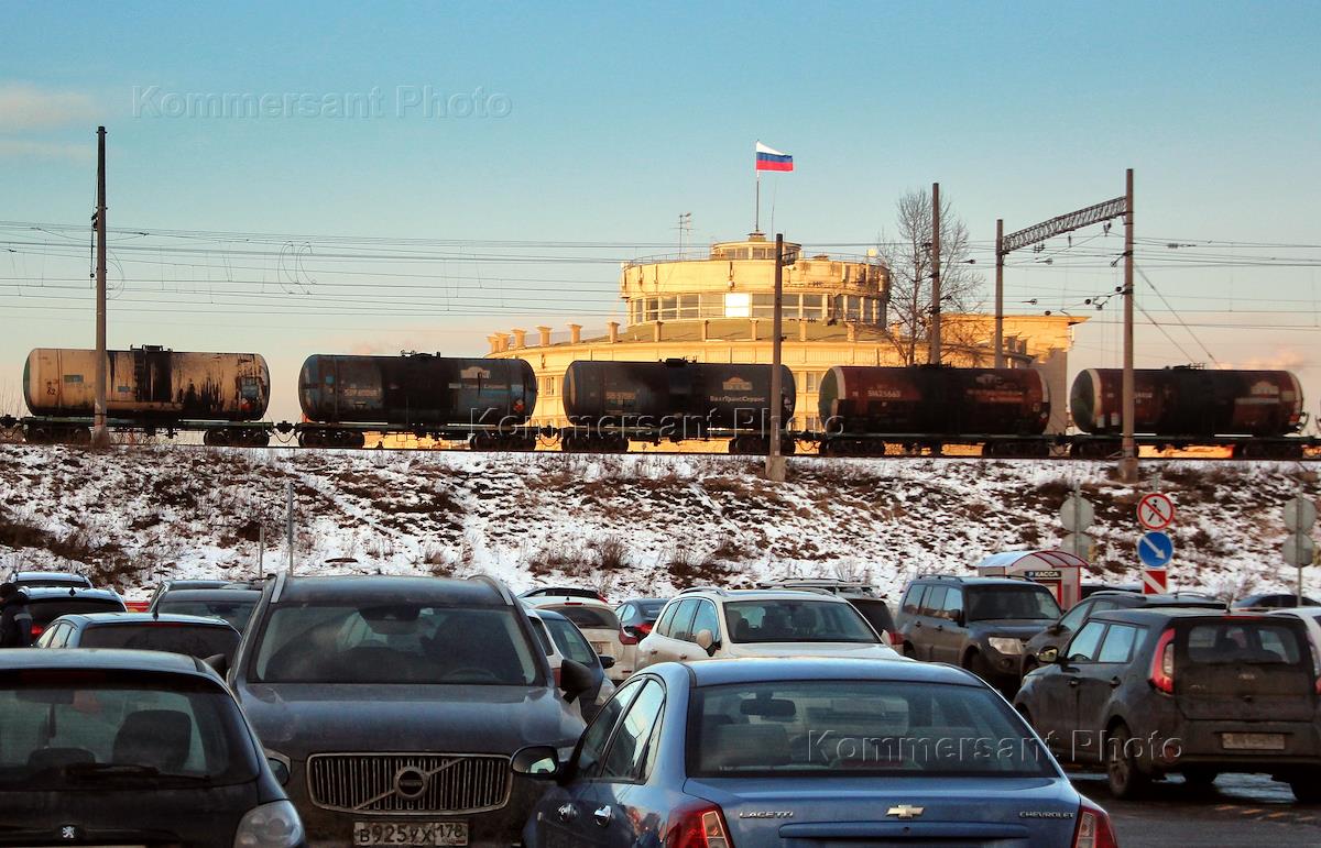 Виды Санкт-Петербурга. Госдураственный флаг (триколор) на здании администрации Московского района. По жележнодорожной насыпи идут цистерны.