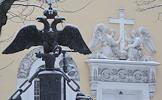Виды Санкт-Петербурга. Преображетский собор. Двуглавые орлы на ограде собора на фоне барельефа "ангелы с крестом".
