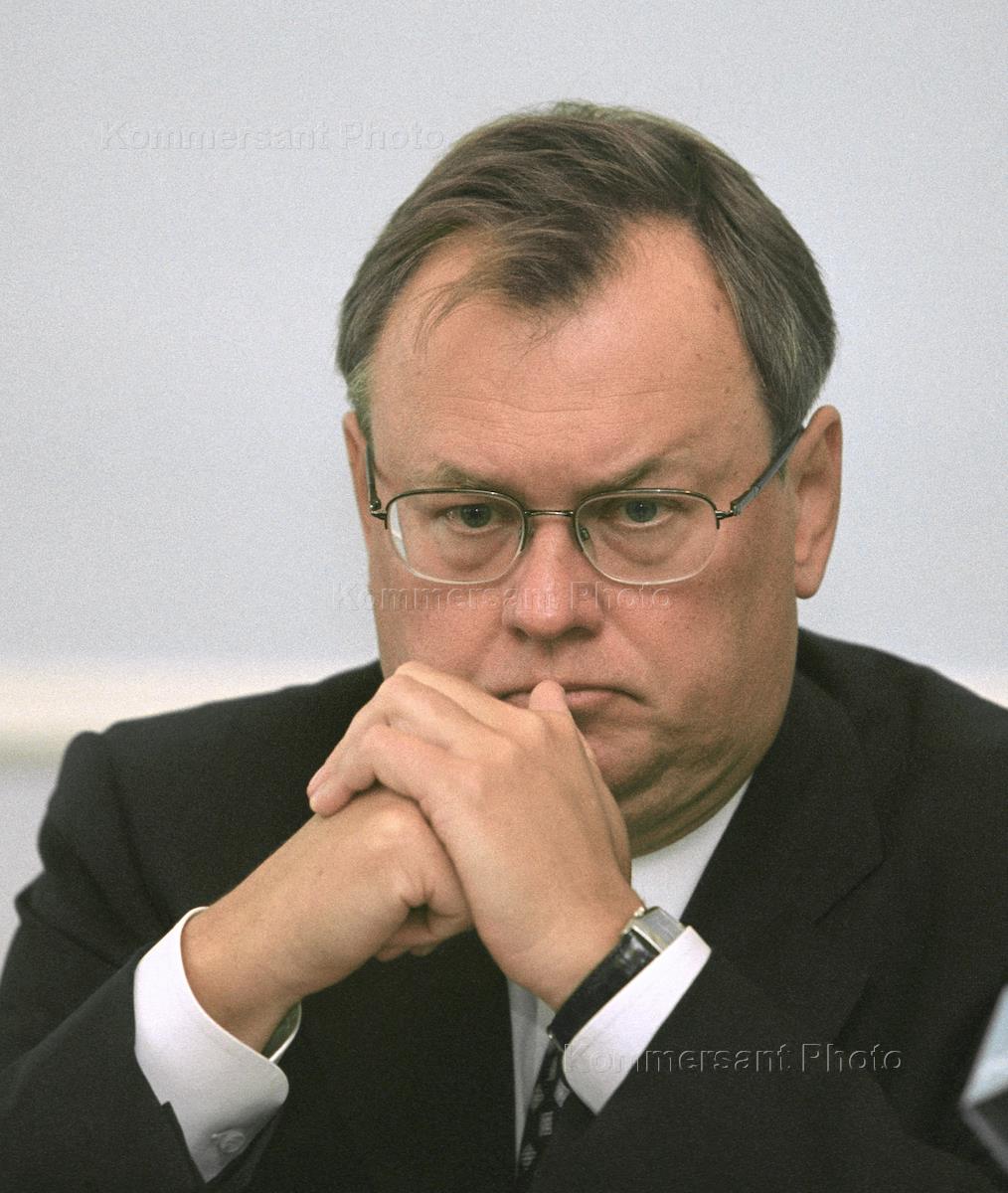 Chairman of the Vneshtorgbank Andrey Kostin attends the ceremony of signing an agreement between the Russian Pension Fund and the joint depository company. The event took place in the Pension Fund headquarters.