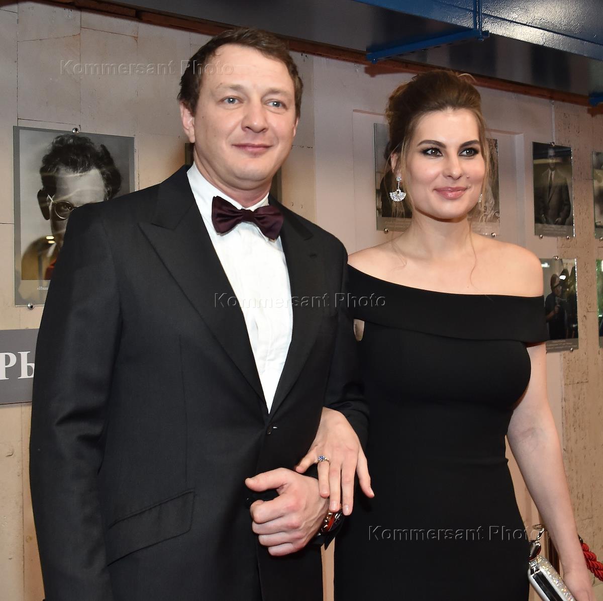XV церемония вручения главной профессиональной кинопремии "Золотой орел" прошла на киностудии "Мосфильм". Актер Марат Башаров с супругой Елизаветой Шевырковой во время церемонии.