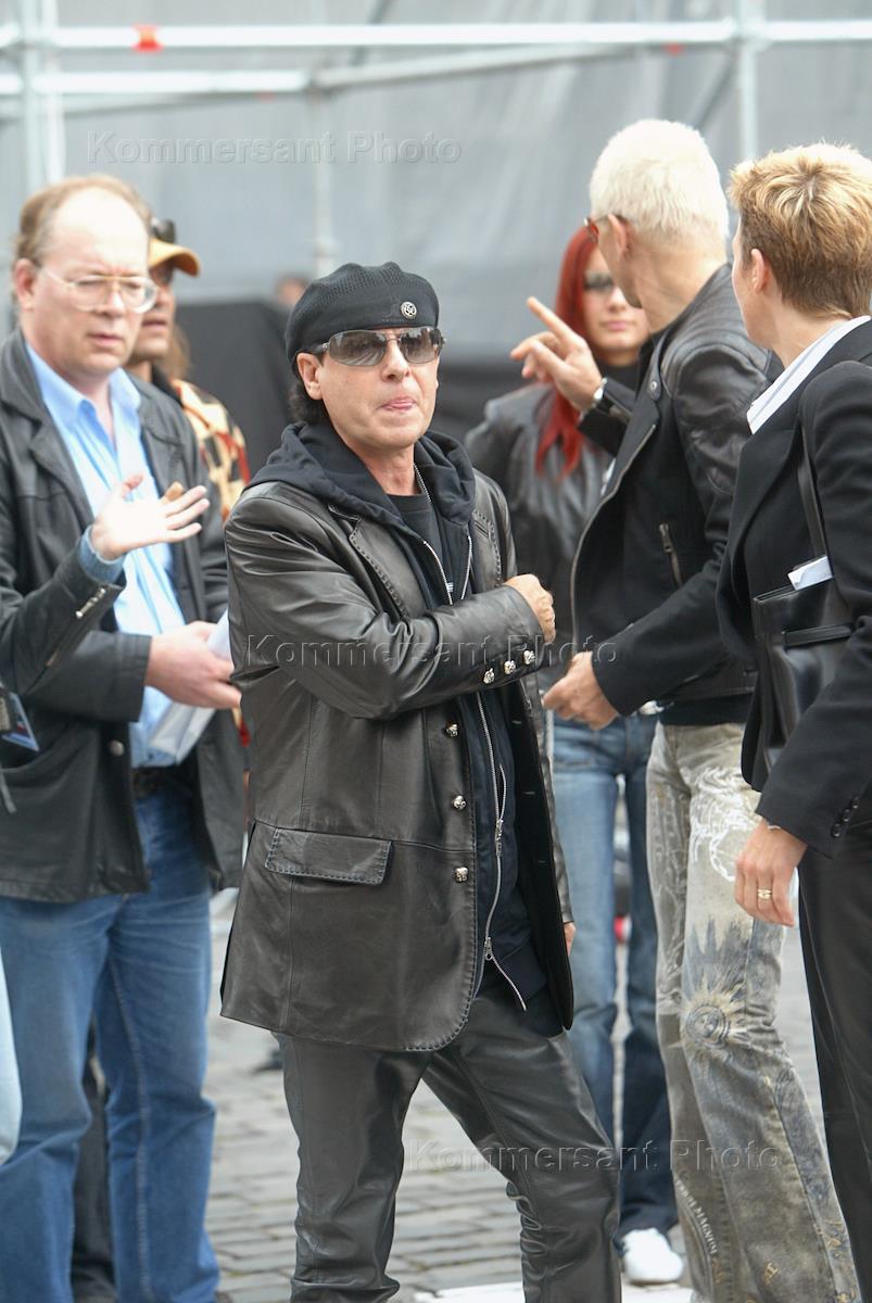 Members of the Scorpions rock ban are interviewed on the Red Square before the show staged by the German designer Gert Hoff.