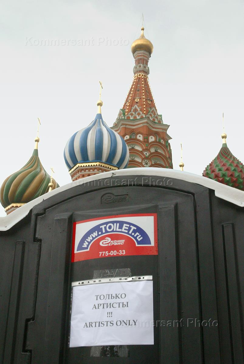 Toilet booths for artists employed in the Red Square Mega Show staged by the German designer Gert Hoff.