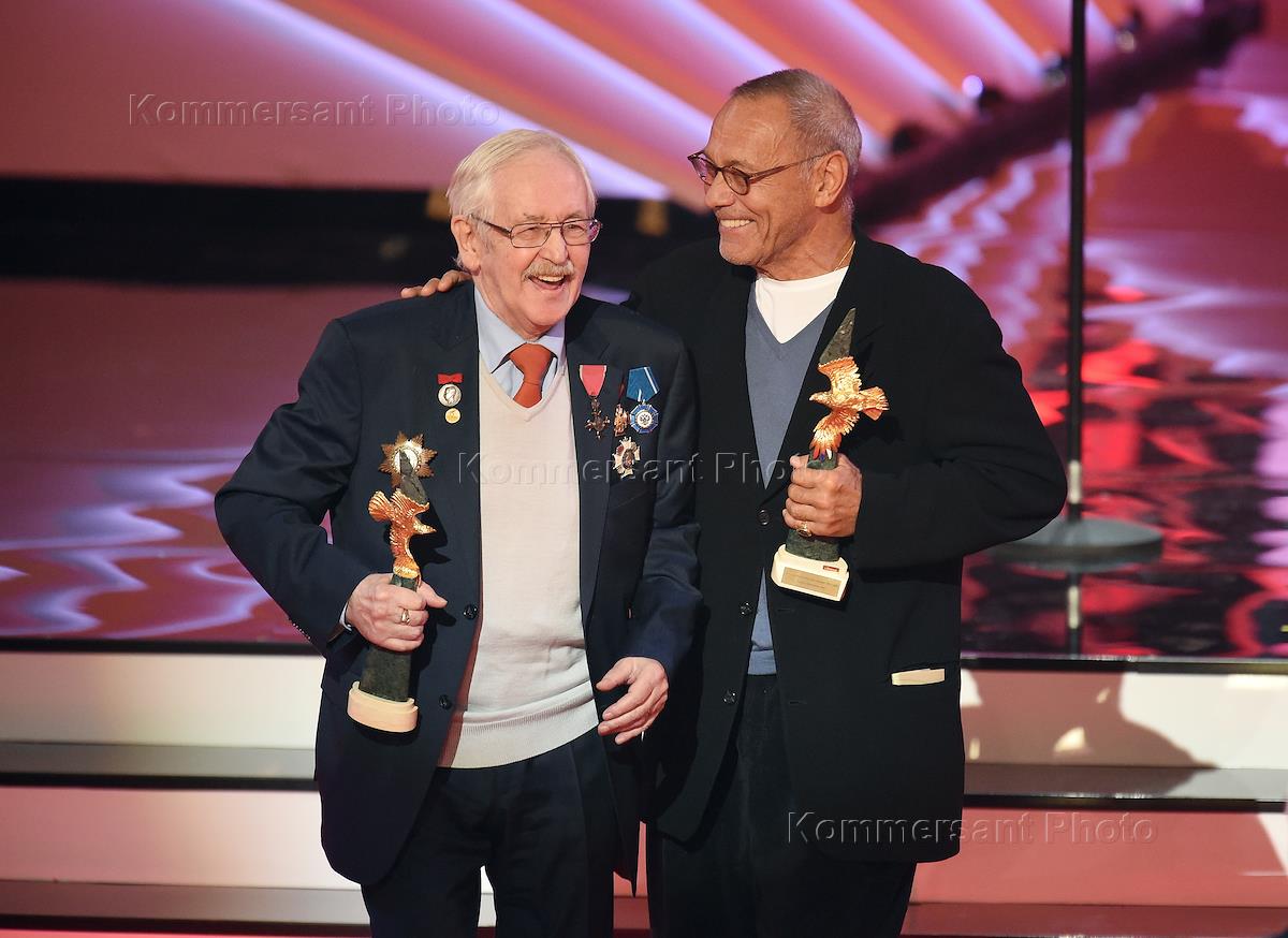 XV церемония вручения главной профессиональной кинопремии "Золотой орел" прошла на киностудии "Мосфильм". Актер Василий Ливанов (слева) и председатель Союза кинематографистов России, режиссер Никита Михалков (справа) во время церемонии.