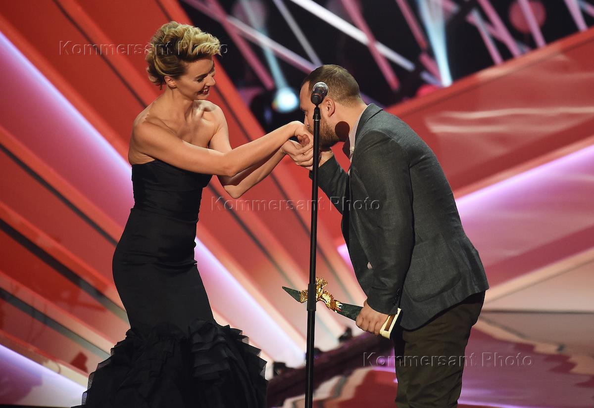 XV церемония вручения главной профессиональной кинопремии "Золотой орел" прошла на киностудии "Мосфильм". Актеры Константин Лавроненко (слева) и Олеся Судзиловская (справа) во время церемонии. Константин Лавроненко получил приз в номинации "Лучшая мужская роль в телесериале".