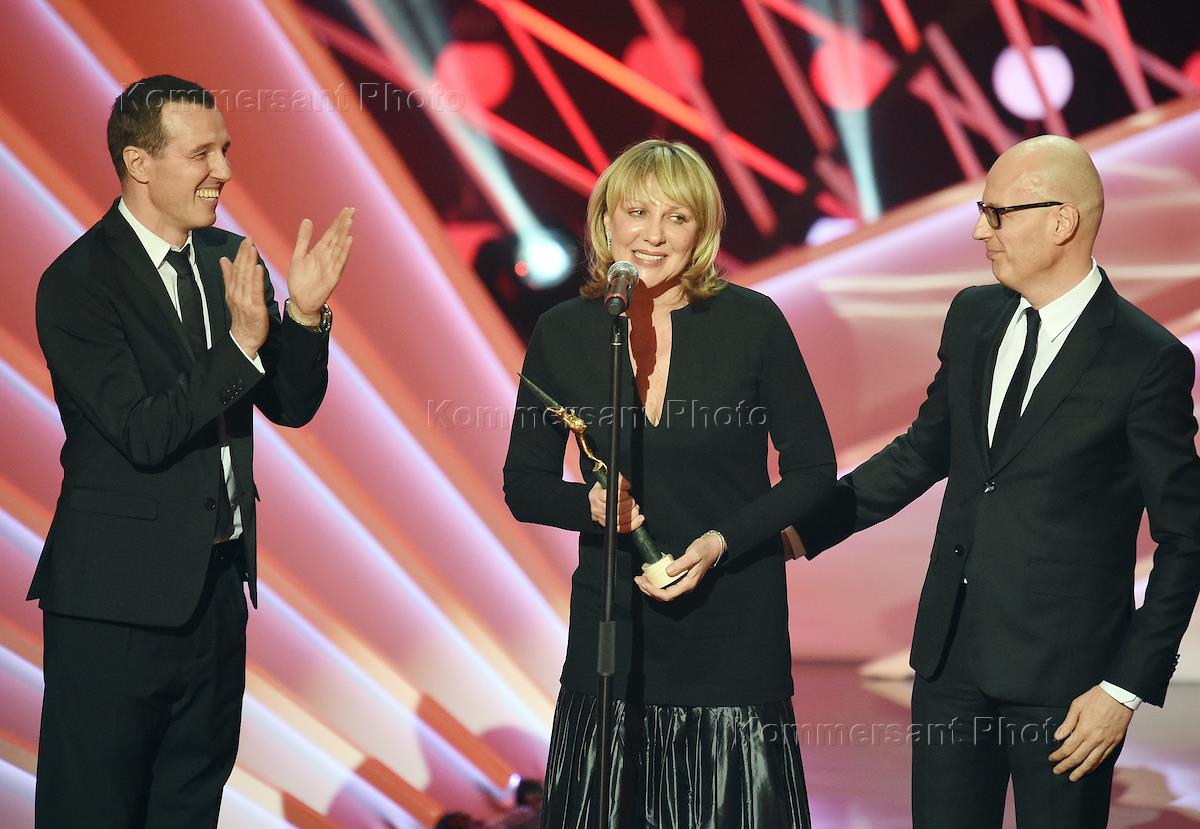 XV церемония вручения главной профессиональной кинопремии "Золотой орел" прошла на киностудии "Мосфильм". Слева направо: продюсер Мария Ушакова, режиссер Сергей Урсуляк и генеральный директор телеканала "Россия-1", первый заместитель генерального директора ВГТРК, член совета директоров "Ростелекома" Антон Златопольский во время церемонии.