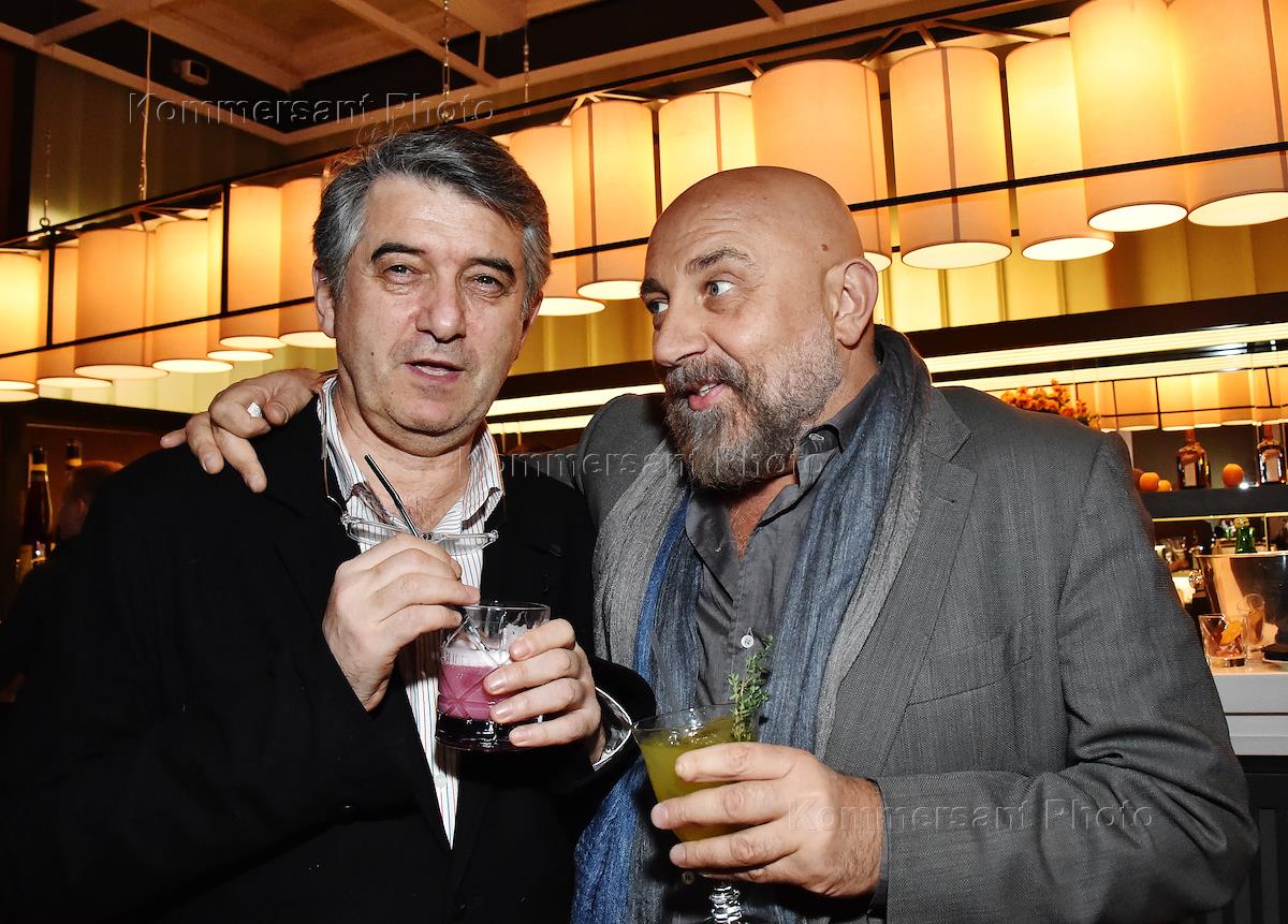 Празднование дня рождения Электротеатра Станиславский и церемония открытия передвижной инсталляции британского режиссера Кэти Митчелл "Пять истин" (Five Truths). Художественный руководитель театра "Мастерская Петра Фоменко" Евгений Каменькович (слева) и художник Павел Каплевич (справа) во время празничного вечера.