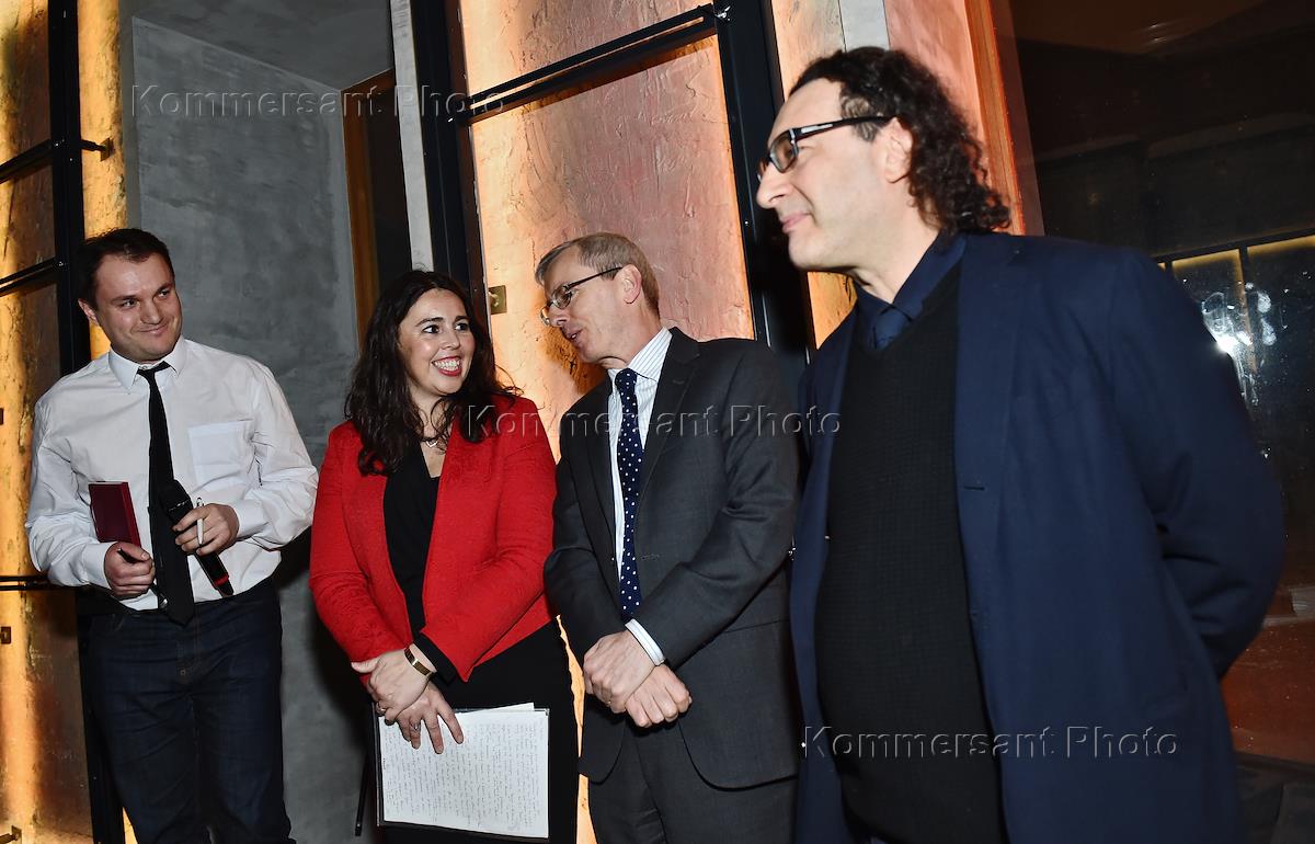 Празднование дня рождения Электротеатра Станиславский и церемония открытия передвижной инсталляции британского режиссера Кэти Митчелл "Пять истин" (Five Truths). Справа налево: художественный руководитель Электротеатра "Станиславский", режиссер Борис Юхананов, посол Великобритании в России Лори Бристоу и куратор Кейт Бейли во время мероприятия.