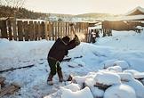 Село Серебрянка. Житель села во время колки дров.