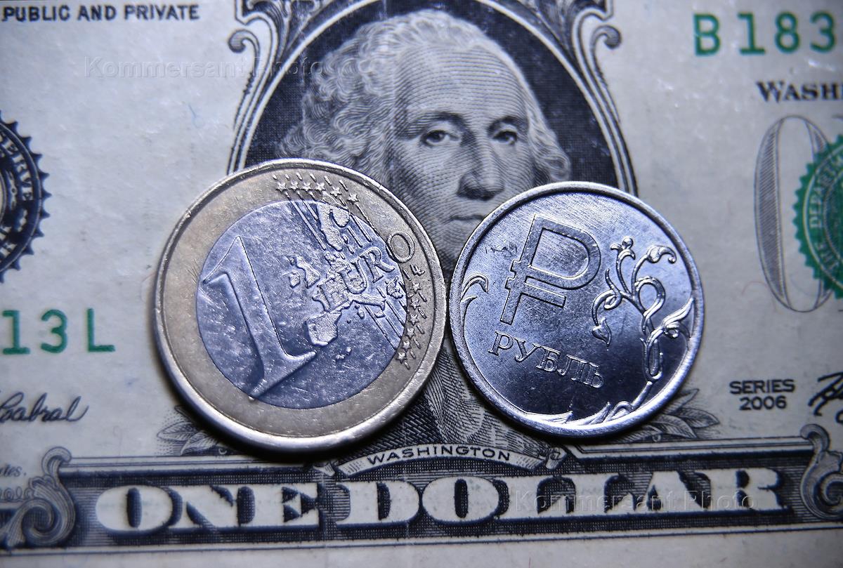 Жанровая фотография. Монета в 1 рубль и 1 евро на купюре в один доллар.
