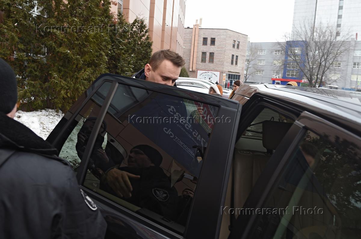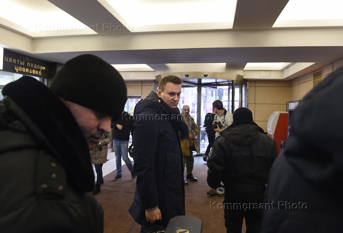 Судебные приставы и председатель партии "Партия прогресса" Алексей Навальный (в центре) в московском офисе Фонда борьбы с коррупцией (ФБК) Алексея Навального. Cотрудники правоохранительных органов пришли в офис ФБК, чтобы доставить главу организации Алексея Навального на заседание кировского суда, которое состоится 1 февраля.