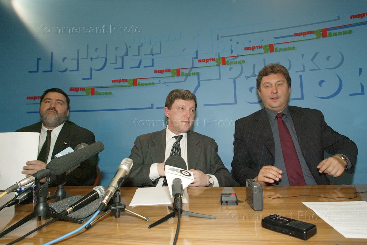 Руководство фракции "Яблоко" в Государственной Думе России, руководитель Григорий Явлинский (в центре), первый заместитель Сергей Иваненко (справа) и заместитель Игорь Артемьев (слева) во время пресс-конференции на тему: "Планы работы фракции "Яблоко" на осеннюю сессию Государственной Думы". Пресс-конференция состоялась в здании Государственной Думы.