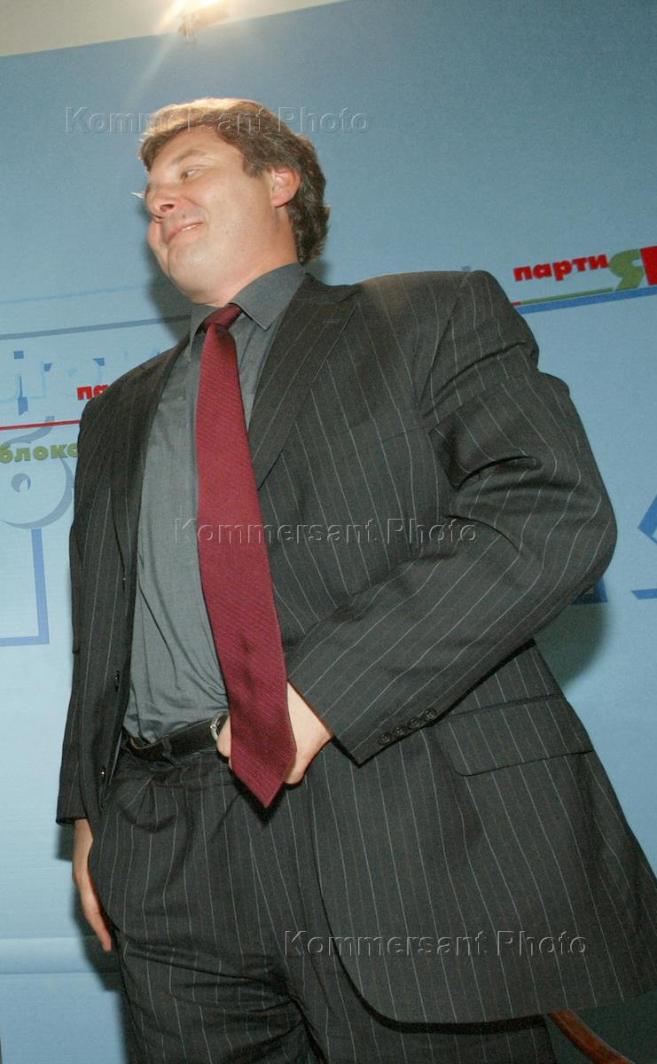 Deputy chairman of the State Duma Yabloko ('Apple') faction Sergey Ivanenko takes part in the news conference summoned to present the faction plans for the State Duma 2003 autumn session. The news conference was held in the State Duma.