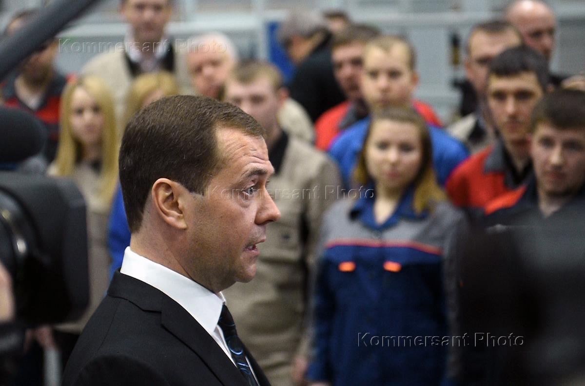 Рабочая поездка председателя правительства России Дмитрия Медведева в Киров. Председатель правительства России Дмитрий Медведев во время посещения предприятия АО "Кировское машиностроительное предприятие" (входит в концерн воздушно-космической обороны "Алмаз - Антей").