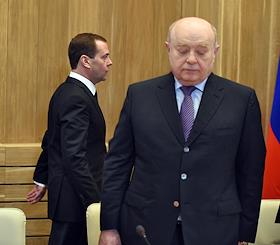 Рабочая поездка председателя правительства России Дмитрия Медведева в Киров. Председатель правительства России Дмитрий Медведев (слева) и председатель Совета директоров "Алмаз-Антея" Михаил Фрадков (справа) перед началом совещания о развитии производственных мощностей организаций оборонно-промышленного комплекса (ОПК). Совещание прошло на площадке АО "Кировское машиностроительное предприятие" (концерн "Алмаз - Антей").