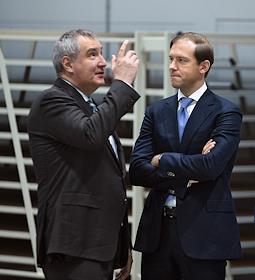 Рабочая поездка председателя правительства России Дмитрия Медведева в Киров. Заместитель председателя правительства России Дмитрий Рогозин (слева) и министр промышленности и торговли России Денис Мантуров (справа) во время посещения предприятия АО "Кировское машиностроительное предприятие" (входит в концерн воздушно-космической обороны "Алмаз - Антей").
