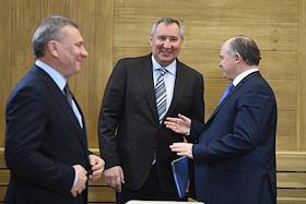 Рабочая поездка председателя правительства России Дмитрия Медведева в Киров. Слева направо: заместитель министра обороны России Юрий Борисов, заместитель председателя правительства России Дмитрий Рогозин и заместитель председателя Военно-промышленной комиссии (ВПК) при правительстве России Иван Харченко перед началом совещания о развитии производственных мощностей организаций оборонно-промышленного комплекса (ОПК). Совещание прошло на площадке АО "Кировское машиностроительное предприятие" (концерн "Алмаз - Антей").